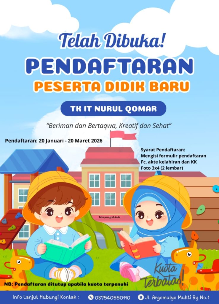 TK IT Nurul Qomar kembali membuka Pendaftaran Siswa Baru 2026/2027.